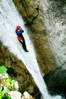 Nem tagadom egy kicsit cidriztem, de belevágtam. Felszerelést megkaptuk. Itt nem kellett mentőmellény, viszont kaptunk beülőt. Elindultunk a Susec patakhoz. Normál esetben 30 perc fölfelé az út, de mint ahogy írtam nem voltam túl edzett formában. Eltekintve attól, hogy a neoprén cipőben pont minden kis szar kavicsot érzel, ráadásul plusz harminc fok, rád kötve a neoprén ruha hátizsákként és lépkedhetsz felfelé a negyven centis lépcsőkön. Később már lépcső se volt, csak a gyökerek által kialakult út, melletted pedig a szakadék. Egyre inkább úgy éreztem nem vagyok normális, de a túravezetőnk - egy szlovén srác, aki csak angolul beszélt - mondta, hogy higgyem el már túl vagyunk a felén már csak a következő kanyar utáni két kanyar van mi mögött szinte csak egy ici-pici emelkedőt követően látszik már az út utolsó harmadának első negyede......